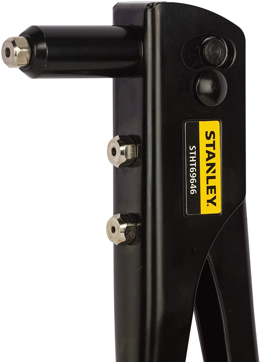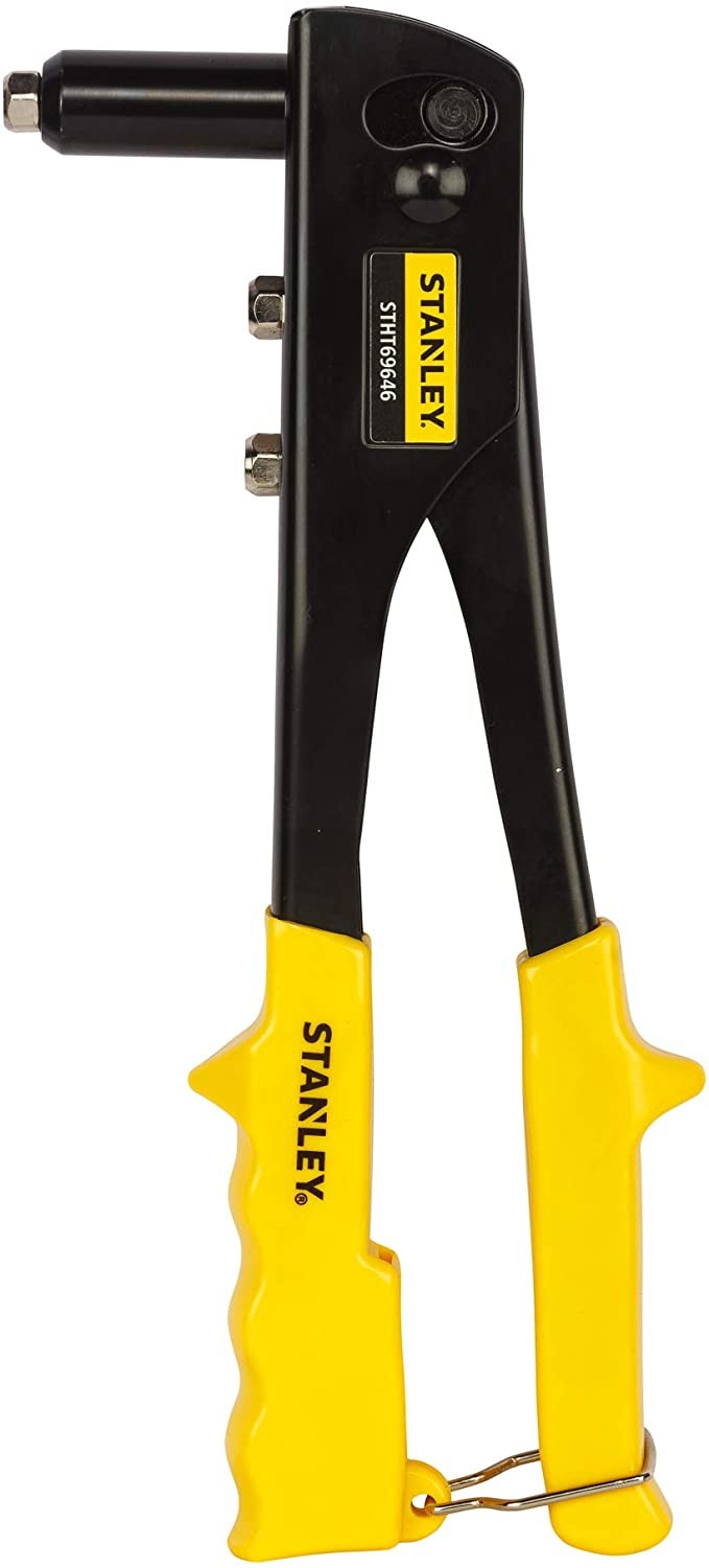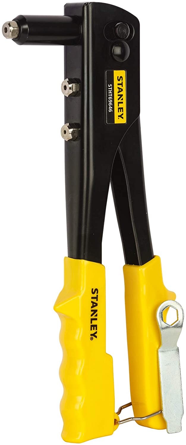 A versatile tool for joining sheet metal, fabric, leather, and plastic parts Spring-loaded handle ejects rivets system All steel body with non-slip grip and wrench for changing nose pieces.