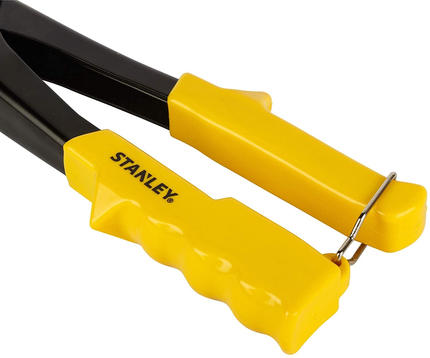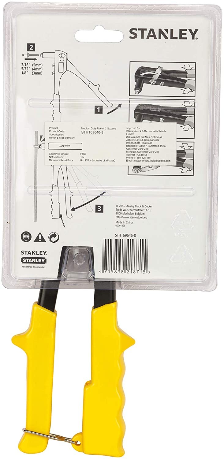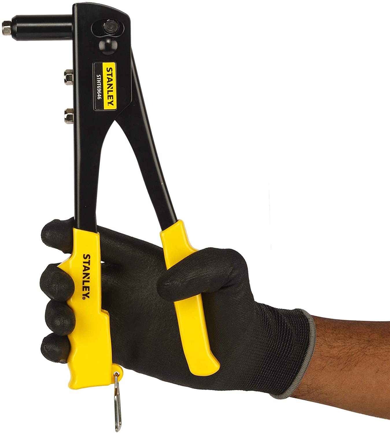 A versatile tool for joining sheet metal, fabric, leather, and plastic parts Spring-loaded handle ejects rivets system All steel body with non-slip grip and wrench for changing nose pieces.