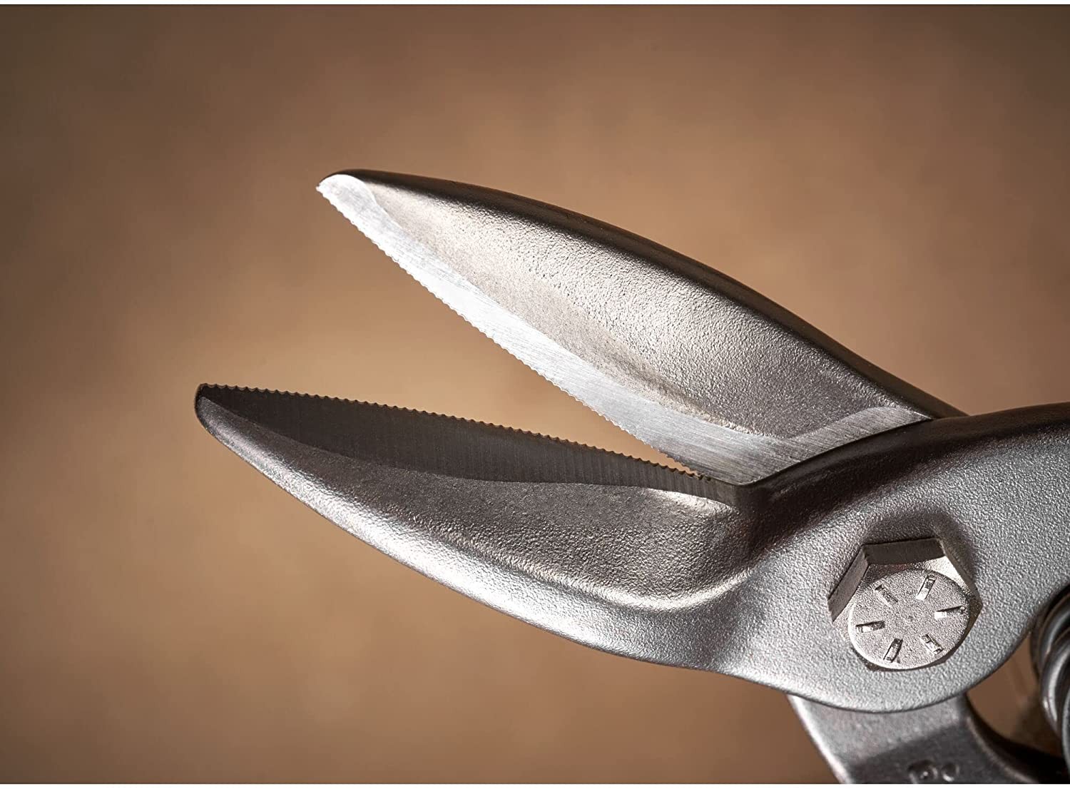 • The straight cut compound action aviation snip is strong and durable. Its serrated cutting blades cut up to 18-gauge cold rolled or 23-gauge stainless steel.