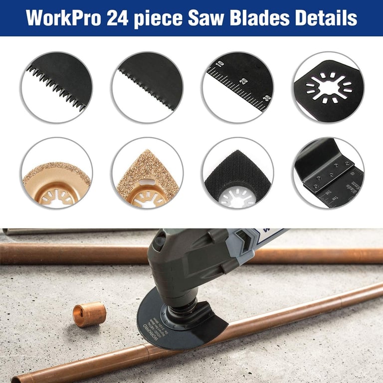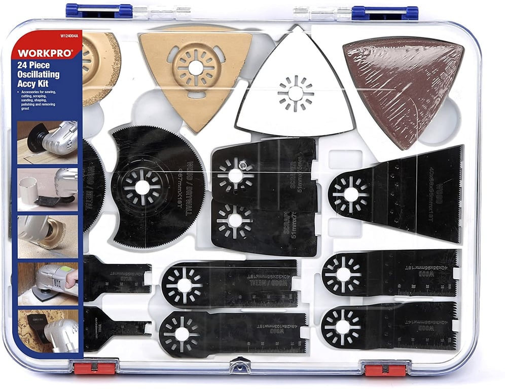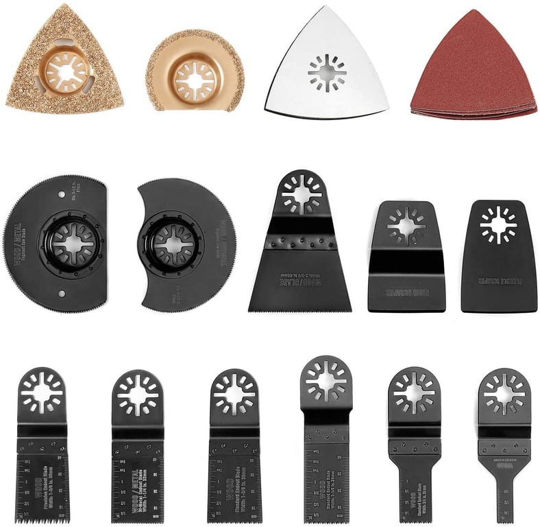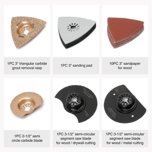 • مجموعة ملحقات متأرجحة 25 قطعة: تحتوي على شفرات قطع بنهايات خشبية / معدنية ، وسادة سنفرة ، ورق صنفرة ، شفرة كربيد ، عرموش ومكشطة لإزالة الجص. تلبية احتياجاتك المختلفة.