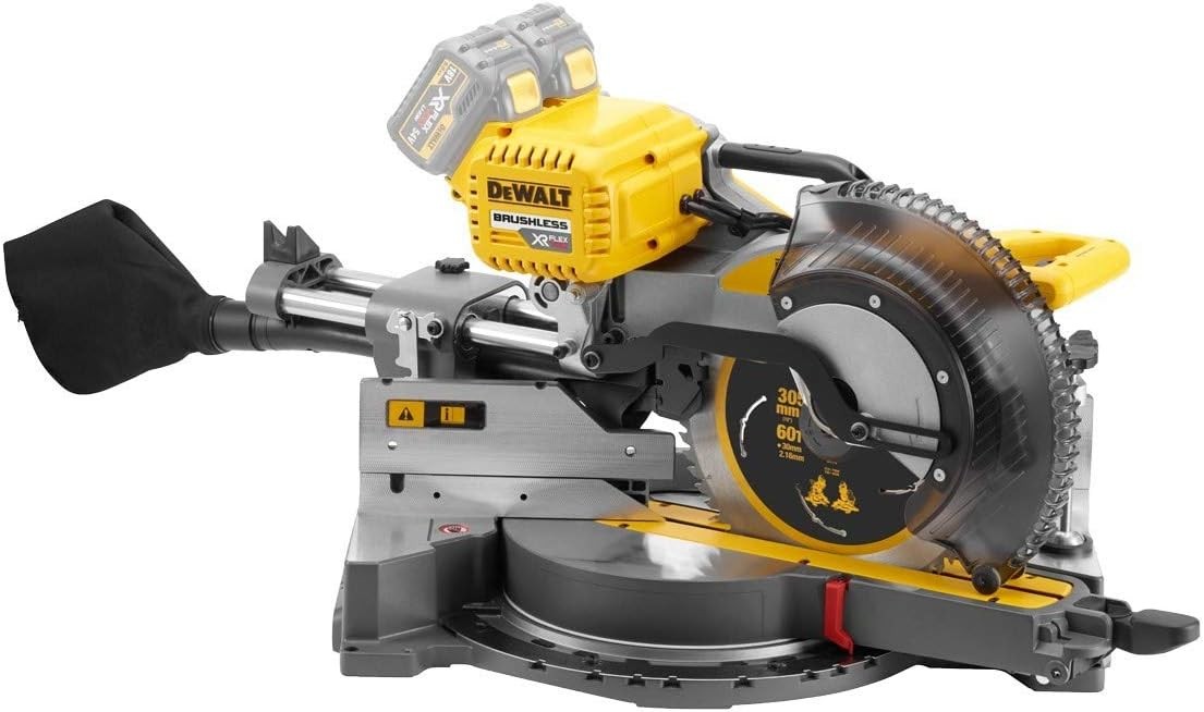 cordless miter saw with a dual 54V XR FlexVolt battery pack that delivers 108V